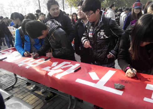 1937年12月13日,日本侵略军占领南京,手刃平民三十万,血流成河,尸积如山…… 为教育和鼓舞同学们勿忘国耻、缅怀先烈,在2013年12月13日暨南京大屠杀76周年纪念日,化学工程学院开展了“勿忘国耻,爱我中华”主题签名活动。