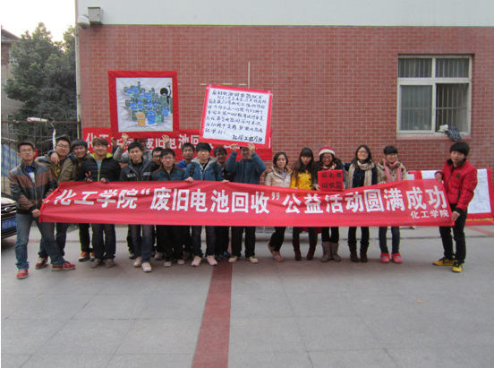 12月13日、14日,在英语四六级考试前后,为了能使全校学生的废旧电池统一规范回收,化学工程学院能源化学工程专业全体同学们分两天三地,分别在本部食堂、北区爱情湖畔和高层宿舍举行了以“能源有限,循环无限”为主题的废旧电池回收公益活动。