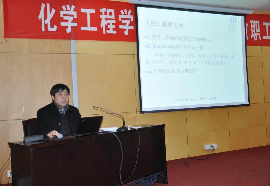 会议在庄重的中华人民共和国国歌声中开幕。院长何杰代表学院做工作报告,报告指出,即将过去的2013年,化学工程学院全院教职员工在学校党政的领导下,紧紧围绕教书育人、科研创新、服务社会的中心工作,爱岗敬业、踏实进取,较好完成了各项工作任务,在教学、科研、学科建设、师资队伍、学生管理、党建与思政工作、教代会和工会工作诸方面取得了新的成就,值得我们精心总结、大力弘扬。同时,报告也客观分析了学院发展中的困难、问题与不足,并就新一年的发展目标、工作任务提出具体计划。