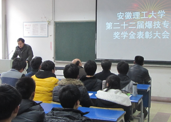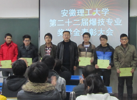 2014年1月2日下午,化学工程学院在北校区隆重举行第22届弹药工程与爆炸技术专业奖学金表彰大会,化工学院院长何杰、学院党委副书记李颖、弹药工程专业负责人郭子如、刘锋及百余名师生共同出席表彰大会。会议由学院团委书记曹秀军主持。
