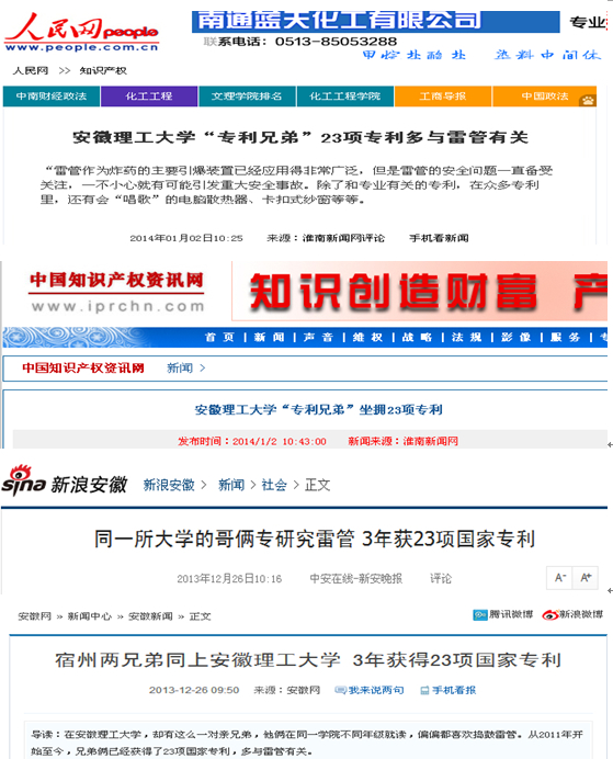 2013年12月26日,安徽网以“宿州两兄弟同上成人漫画 ,3年获得23项国家专利”为题进行了报道。随后,人民网、中国知识产权咨询网、中国招商引资网、商标新闻、新浪网安徽新闻、中国网魅力安徽、中安在线、安青网、安徽交通信息服务网、淮南市人民政府网、淮南报业新闻网、淮河风情网、芜湖新闻网、鸠兹网、万家热线、阜阳公众网、大宿网今日宿州、宿州在线、枞阳在线、萧县在线也以“同所大学亲兄弟专研究雷管,3年获23项国家专利”、“成人漫画 ‘专利兄弟’23项专利多与雷管有关”、“成人漫画 ‘专利兄弟’坐拥23项专利”等题目进行了转载报道。