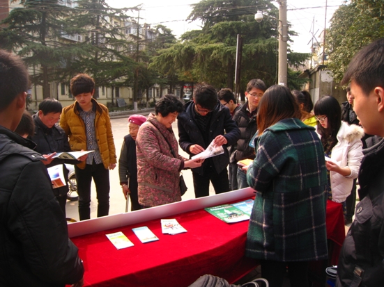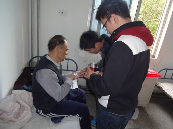 一个月的时间里,志愿者们深入敬老院、淮南各社区进行走访调查、帮扶慰问。在理工大社区,联合医学院师生开展了以“学雷锋,孝老敬亲,传承中华美德”为主题帮扶活动,宣传预防老年疾病的知识,发放医疗保健宣传手册,免费测量血压。在淮南六个社区,志愿者们在居委会的帮助下,走访、调查,认真记录困难老人的住址、电话、健康状况、收入情况、亲情情况、邻里关系等。在了解了老人的家庭和个人生活情况后,志愿者们带着提前买好的时令水果、牛奶等慰问品,深入到困难老人家里进行帮扶。在侯波老师家里,志愿者们送老人去医院、拿药、换洗衣服;在李元福老人家里,陪老人洗澡、聊天、打扫卫生……