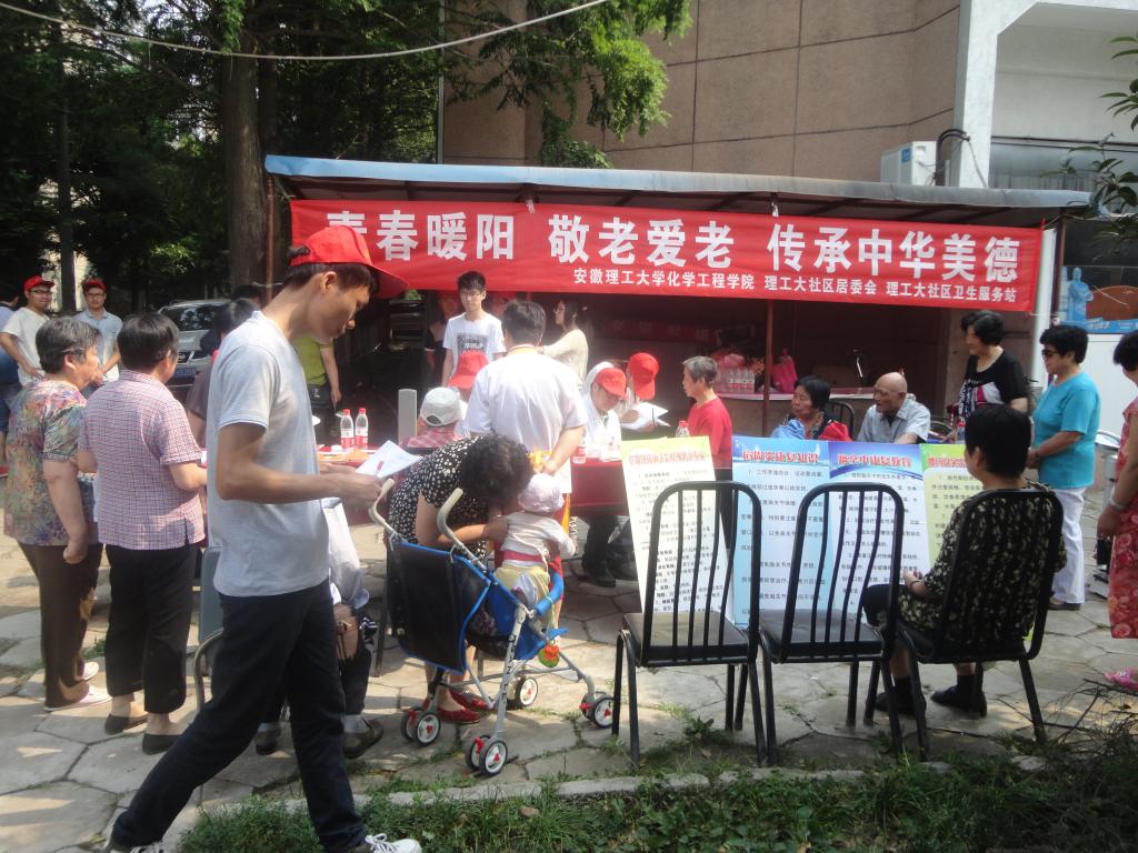 6月4日上午,化学工程学院联合理工大社区居委会、理工大社区卫生服务站在本部家属区举行了以“青春暖阳,敬老爱老”为主题的免费为社区老人测血糖血压等健康服务活动。田家庵区卫生局党组书记张晓光、朝阳街道社区卫生服务中心主任卢斌、朝阳街道社区卫生服务站站长张萍、理工大社区居委会主任刘守则、学院关工会副主任汪大立、学院团委书记曹秀军及暖阳爱老团10余位成员参加活动。