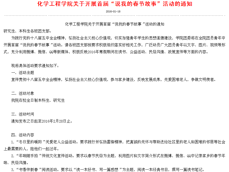 寒假在即,化学工程学院为了充分利用好这个“空档期”, 让学生度过一个有意义的寒假,精心设计了“说我的春节故事” 为主题的寒假作业活动方案。
