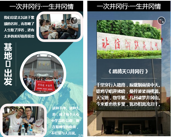 作品以化工学院“群众路线新故事”寻访团参加2015年“井冈情•中国梦”大学生暑期实践季为题材,以图文结合的形式讲述了为期9天的学习实践和课题调研活动,再现了井冈山革命斗争时期的军民故事,记录了实践队员在基地实践中的收获和感悟。该作品传递了接地气的正能量故事,展现了青年人积极向上的精神面貌,很好地将历史与现实、理论与实际、学习与实践结合了起来;充分展示了成人漫画