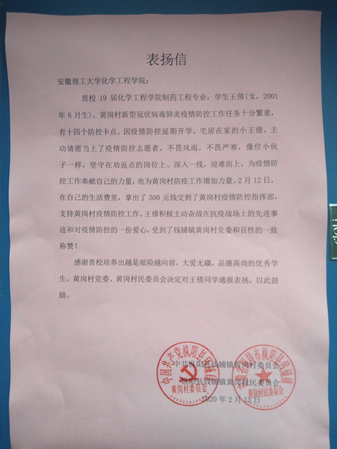 2月13日,铜陵市枞阳县钱铺镇黄岗村疫情防控指挥部收到一笔500元的特殊捐款和一封志愿服务的信件,表明自己志愿参与新冠肺炎疫情防控,落款名为王倩。经核实,王倩为成人漫画 化学工程学院制药工程专业2019级学生,为此枞阳县钱铺镇黄岗村向化学工程学院发来表扬信。