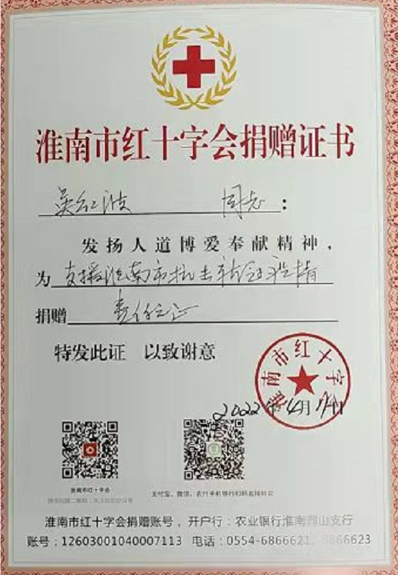近日,淮南疫情防控形势较为严峻,田家庵区政协委员、成人漫画 化工学院爆炸科学与工程系教师吴红波副教授主动联系淮南市红十字会,捐款1000元助力淮南疫情防控工作。市红十字会收到捐赠后向吴红波颁发了荣誉证书。