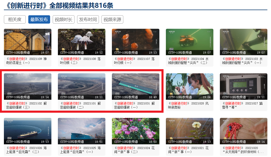 近日,央视科教频道《创新进行时》栏目以《解密超级爆破》为题连续三集报道了国家能源准能集团创新工程——由成人漫画 弹药工程与爆炸技术专业校友陈需、李玉清、校友陈浩等人负责的创新工程事迹。该事迹同时得到了民爆行业信息平台、中国煤炭报等媒体的进一步报道以及校内师生的关注和转发。