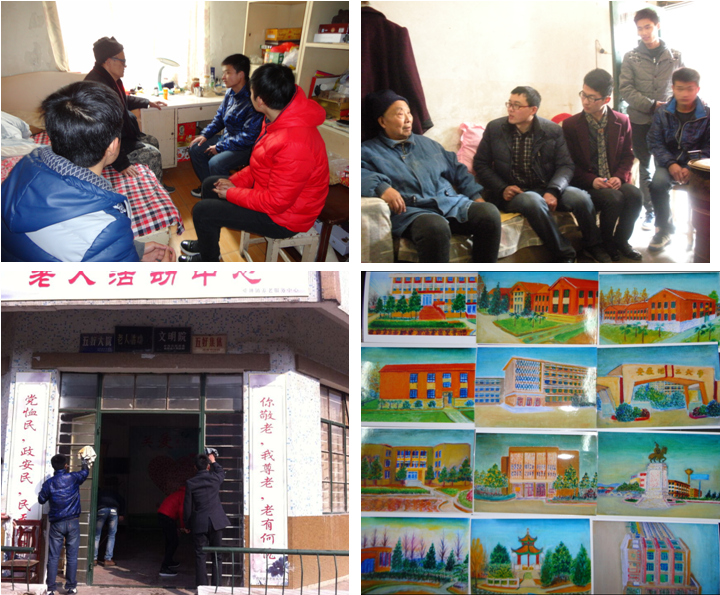离开敬老院,同学们又来到理工大社区,走访慰问社区内的困难老人。在社区主任刘守则的带领下,分别来到侴万禧、侯波、曾照英等老人家中,为老人们送上了香蕉、苹果和元宵。大家亲切地围在老人的身边,询问他们的的身体状况,陪他们唠家常。侯老师的母亲热情地拿出瓜子和糖果款待学生们,侯老师为大家讲述了自己当年求学的坎坷经历,并嘱咐志愿者们好好学习,珍惜美好的大学时光。侴万禧老师还给每个学生都送了一套自己自1998年起创造的、反应学校和淮南建筑的油画照片,一幅幅精致的油画蕴含着老人对学校的丰厚感情,对教育的热爱。在曾照英老人家中,同学们聚精会神的聆听着老人们的教诲,老人们越说越起劲,还讲述了一些求学时的奇闻趣事,逗得志愿者们哄堂大笑。一时间,屋子里洋溢着欢快的气氛,老人也仿佛年轻了许多,和大家一起沉浸在曾经的成长之路中。