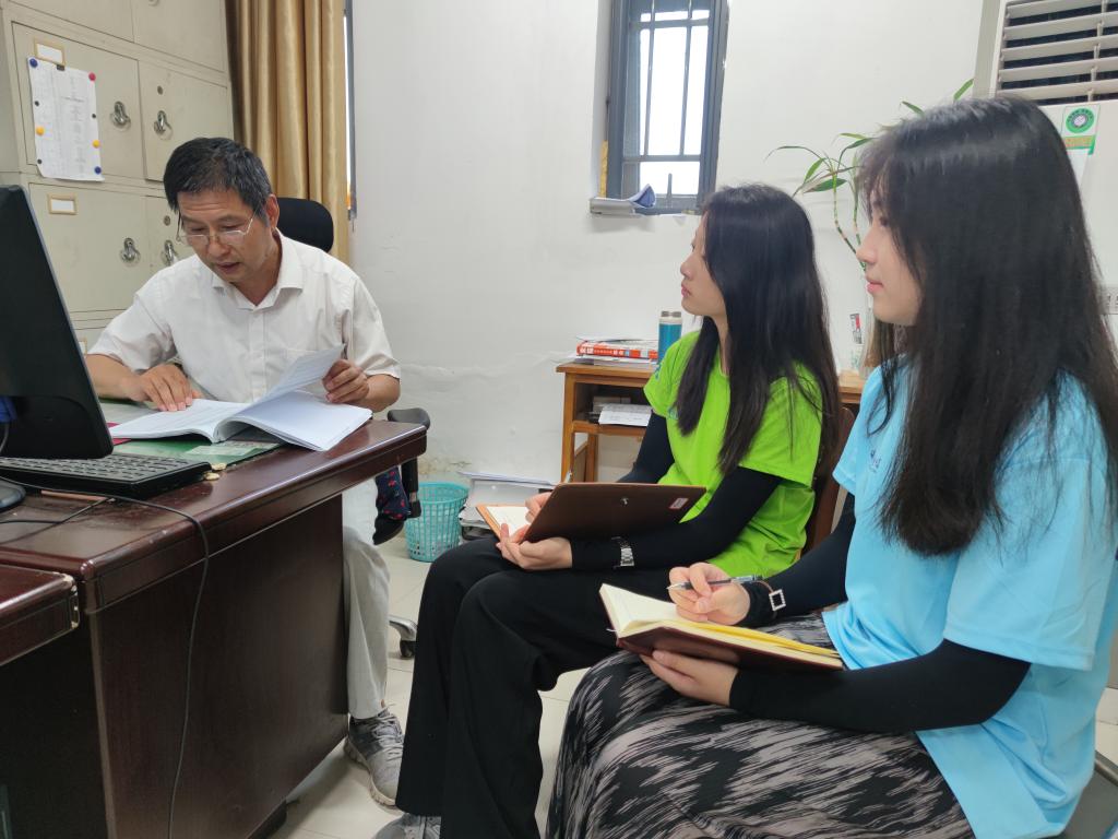 7月8日上午,实践队员来到档案馆,采访了原档案馆馆长黄守友老师。黄老师介绍了学校建校历史上部分老教师的突出典型,带领实践队员查阅了史料,遴选了一批拟采访对象,为系统采集红色校史人物和故事奠定了基础。