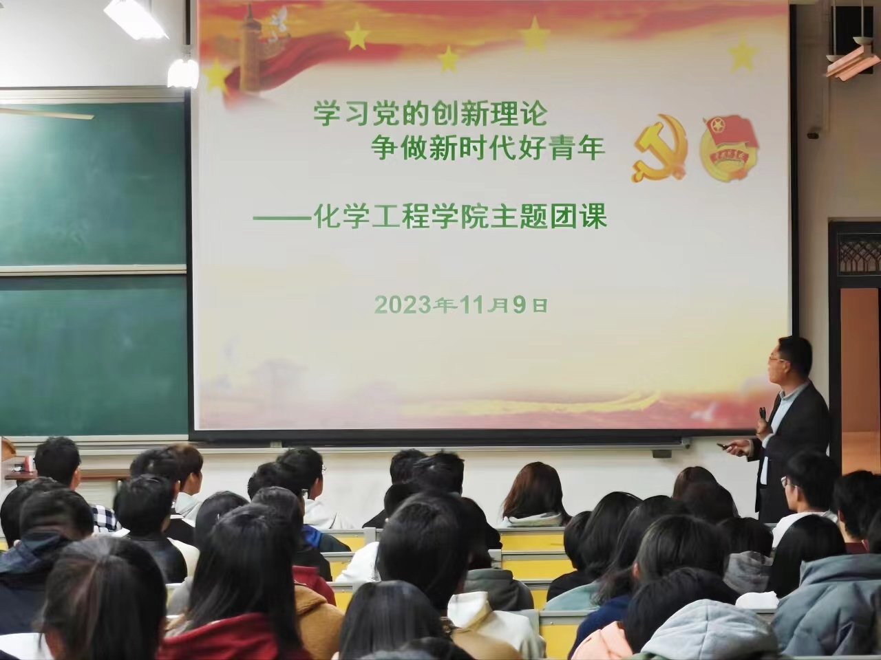 11月9日晚,化工学院在明理楼302教室开展了主题教育专题团课。学院团委书记杨志华为学院学生组织全体成员上了一节题为“学习党的创新理论,争做新时代好青年”的主题团课。