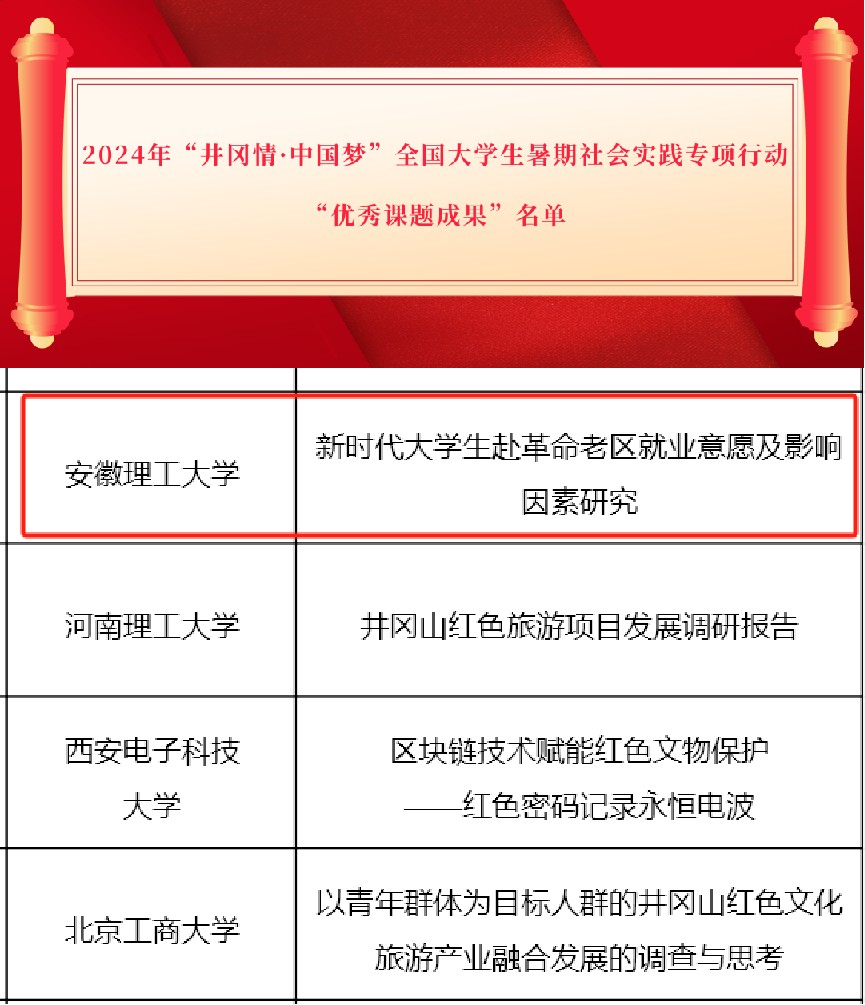 据悉,团中央青年发展部、全国青少年井冈山革命传统教育基地组织开展的“井冈情·中国梦”全国大学生暑期社会实践专项行动,从全国6000余名大学生中招募实践团队,赴井冈山开展党史学习、红色教育、国情考察、调查研究等实践活动。本次专项行动评选出75项优秀课题成果、32支优秀宣传团队。