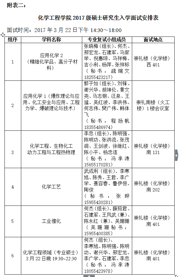 (7)面试时间、地点、分组安排见附件化学工程学院2017级硕士生入学面试安排表。未尽事宜另行通知。